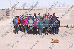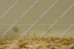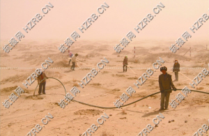湖区的居民冒着风沙在沙地里种植沙生植物。