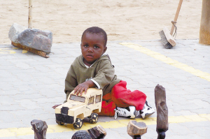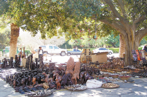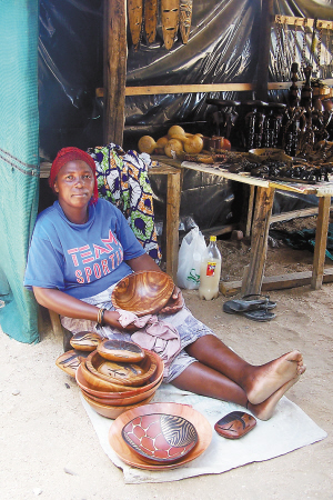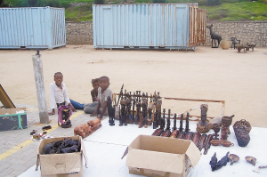 小镇奥卡汉贾(Okahandja)距离首都温得和克70公里,是纳米比亚有名的木雕市场。市场很简陋:竖几根木桩做支撑,撑几张帆布当房顶墙壁,支几块木板做柜台,如此搭成的两三排长的棚屋就是店铺。小木雕摆放在柜台上,大的则直接摆放在地上。来纳米比亚的游客都喜欢到这里参观一下,顺便买几件中意的木雕做纪念。